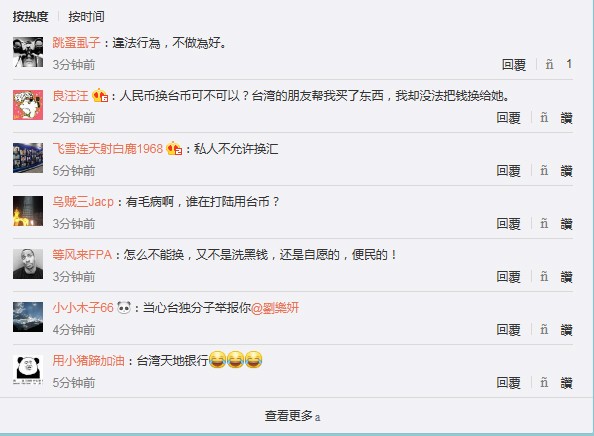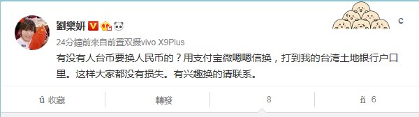 今天早上11點半左右,劉樂妍公然在微博發文:「有沒有人台幣要換人民幣的?用支付寶微嗯嗯信換,打到我的台灣土地銀行戶口裡,這樣大家都沒有損失,有興趣換的請聯繫。」