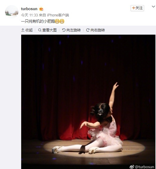 孫儷不僅演技精湛,美術及畫畫功力更令人驚艷,相當的多彩多藝,而女兒也不遑多讓,才3歲的小花已經可以登台表演芭蕾舞,今日孫儷便分享出多張女兒表演時的照片,只見小花綁著包包頭,身穿著芭蕾舞衣,不論轉圈或坐在地上的動作都難不倒她,看起來架式十足,有些肉肉的雙腿和小手更是吸睛,孫儷也笑說女兒是一隻純有機的小肥鵝,照片一PO出引起熱烈討論,沒想到鄧超看了竟留言「放過女兒,我剛出門就欺負她」,更不忘稱讚小花的動作「多美,多舒展」,讓粉絲笑說「是你先放過她吧」、「娘娘只會欺負你」。