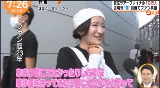 安室奈美惠在東京巨蛋舉行的最後一場演唱會,門票以秒殺速度完售,沒能進場的聽眾竟然祭出奇招,讓人大開眼界。當日東京巨蛋的演唱會外,聚集了兩千多名因為沒有買到票而無法入場的粉絲,其中一位職業為護理師的鐵粉,竟然拿出「聽診器」隔牆聽演唱會,讓人見識到何謂強大。