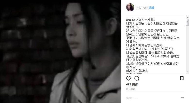 河莉秀29日在Instagram曬出黑白照,「在這世上活著,所愛的人因自己聽了一堆難聽的話,因為愛我被別人指指點點,我能為我愛的人做什麼呢?我的存在可能本身就是個錯誤,閉上眼睛希望不要再醒來了。」