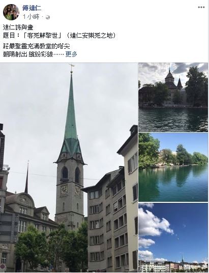 傅達仁作詩〈客死蘇黎世(達仁安樂死之地)),讚嘆瑞士自然風光,提到朝陽、晚霞漂染教堂,山、湖映景,茂密樹團有白雲一片,織出蓬鬆的裙邊,相當富有文采,傅達仁浪漫說:「謝主恩典,幫我製作如此美艷和壽衣和墓園!」