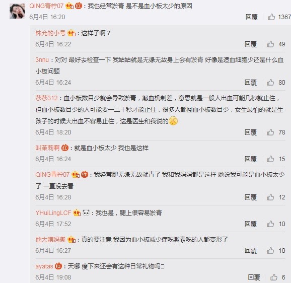 事實上血小板不足可能導致止血不易而瘀青,過瘦、營養不良、葉酸攝取不足的人皆是高危險群,有同樣身材纖細的粉絲表示自己就是因此而瘀青,勸林允不要因身材而弄壞了身體。