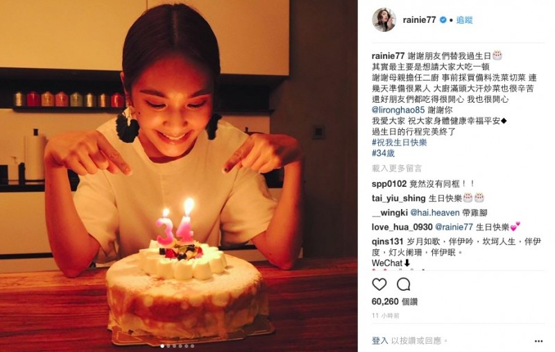 楊丞琳過完生日當晚,在IG發文感謝朋友們為她過生日,身邊齊聚了王心凌、金勤等一幫好友,今年大家齊聚在她家,由楊媽擔任二廚,「謝謝妳事前採買備料洗菜切菜,連幾天準備很累人。」她也不忘感謝大廚,表示看著對方掛著汗珠煮菜,為她辛苦付出的,她全都看在眼裡,最後Tag男友李榮浩的帳號寫著「謝謝你」,明示大廚就是男友。