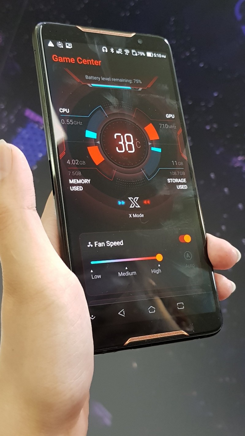 (四)可拆式散熱風扇,玩遊戲不燙:電競手機和電競筆電一樣注重散熱,華碩ROG Phone除了主打GameCool 3D均溫板冷卻系統,搭配外掛可拆式AeroActive Cooler空氣動力風扇,大幅增進散熱,實際把手放在風扇前,真的能感受到微風吹出。