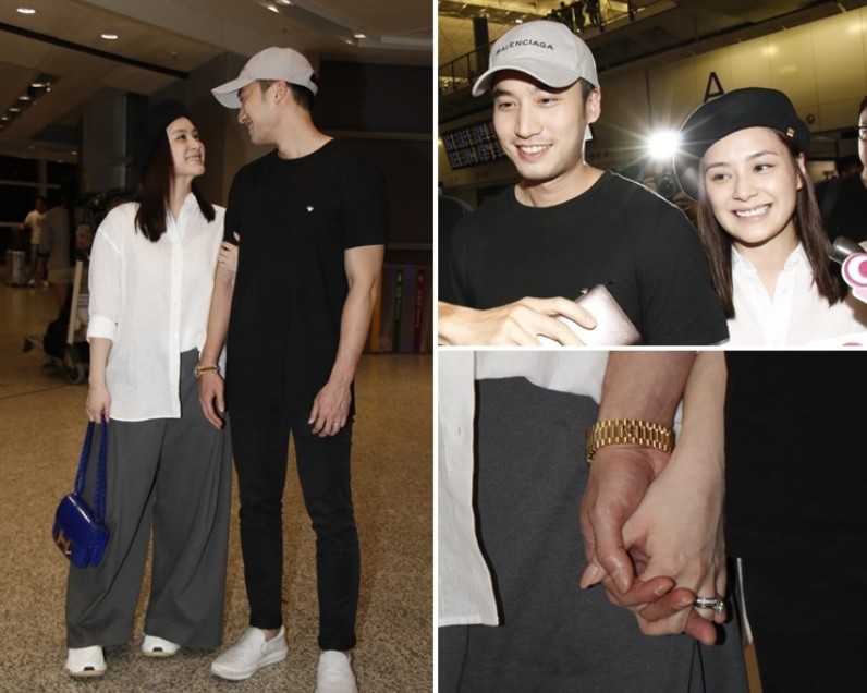 〔記者羅凌筠/台北報導〕37歲「阿嬌」鍾欣潼今和老公賴弘國現身香港,在機場先投射一發閃光彈,兩人鏡頭前對視甜笑,阿嬌也秀出「賴太太」專屬3克拉婚戒,但被拱親親,阿嬌還是害羞拒絕。