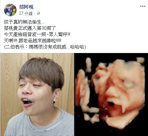 蔡阿嘎成為準爸爸後時常在臉書分享老婆懷孕的大小事,他開心宣布兒子已經邁入第30周,並貼出蔡桃貴最新的超音波照,透露眾人看到後都驚呼「天啊!跟老爸越來越像啦」,他也特別秀出對比圖,只見他學兒子半睜眼睛及張開嘴巴,父子倆的超高相似度讓他直呼「孩子真的無法偷生」,更笑說二伯覺得很沒有成就感。粉絲們看了也表示「完蛋了!為什麼不像媽媽」、「好險蔡桃貴不是女娃」。