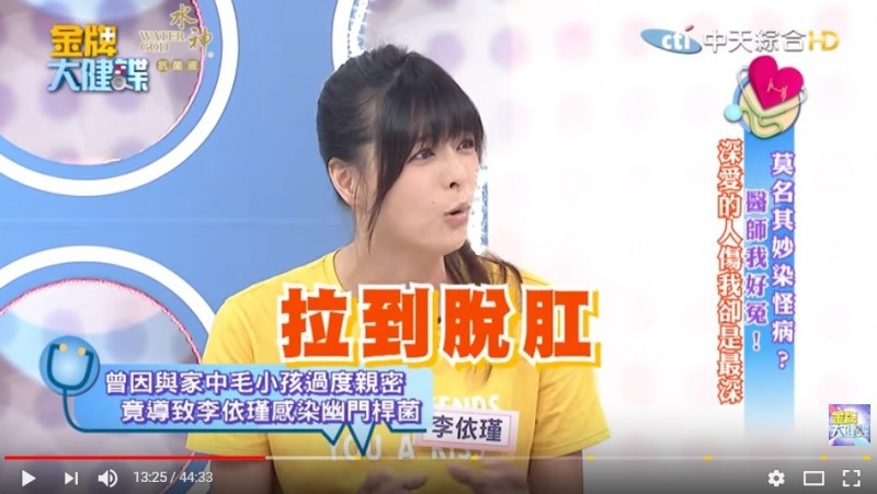 5日播出的《金牌大健諜》聊到「莫名其妙染怪病?醫師我好冤!」李依瑾透露,和愛犬關係親密,平時除了睡一起,吃東西也會用筷子「你一口我一口」餵食,沒想到卻被感染幽門螺旋桿菌,該病症狀會出現嚴重腹瀉、嘔吐及食欲不振。