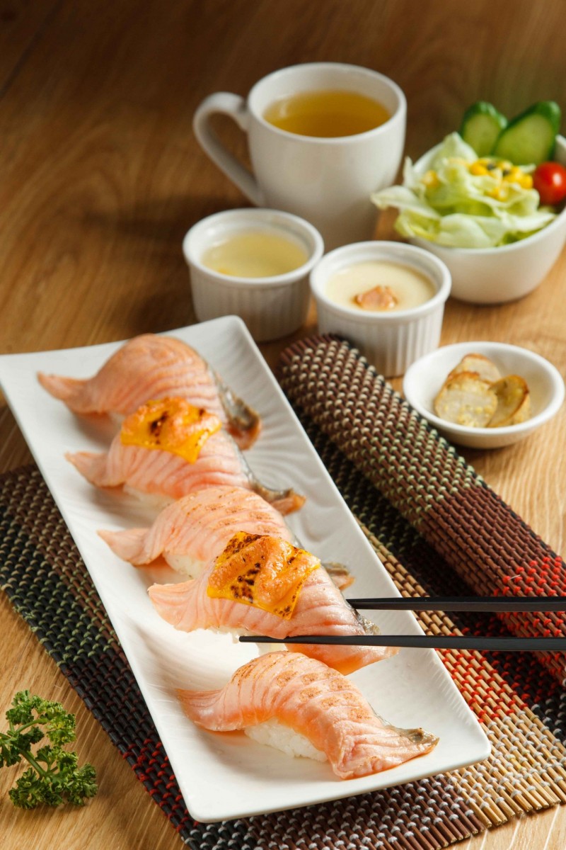 「炭烤鮭魚菲力佐陽光時蔬」(附竹炭麵包)套餐定價340元、「加州起司炙燒鮭魚握壽司」套餐定價250元(套餐含主餐、季節開胃小點、鮭魚茶碗蒸、鮮蔬沙拉、手工甜點、茶飲)。此外,美威鮭魚即日起端出期間限定的風味餐點-「焦糖鮭蜜握壽司」,將產地直送的新鮮鮭魚、美乃滋佐焦糖炙燒、「焦糖鮭蜜握壽司」2貫定價99元,消費套餐即可以優惠價79元加購。