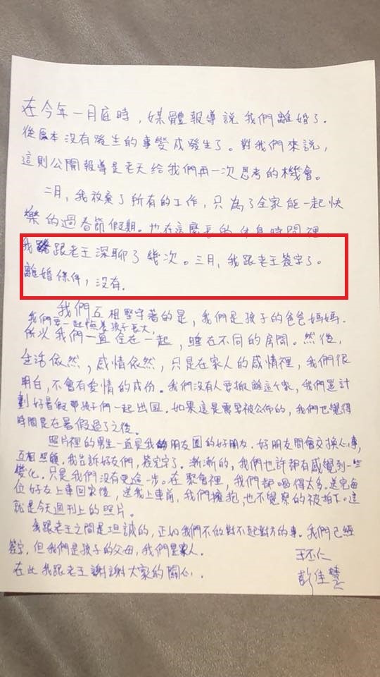 彭佳慧坦言:「感情的事,尤其夫妻之間,我不知道如何跟大家說;這是我跟老王一起完成的聲明稿!謝謝大家的關心,無論如何,我們都會繼續為了孩子們努力。」