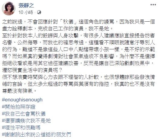 張靜之今(7)日在臉書發文,表示自己曾說過不會回應網友對「秋儀」這個角色的謾罵,因為她只是盡力去詮釋這個角色,也在最後強調:「我不是她。」因為近來有太多觀眾深陷戲劇效果,而去遷怒現實中的演員,並且針對本人的毀謗與人身攻擊讓她已無法再忍受,雖然不想浪費時間去與不理智的人計較,但實在忍無可忍,也不排斥對辱罵的網友提告,最後也在文末Hashtag飆註「開始拍照存證」、「我自己也會罵秋儀」、「還要講幾次我不是她」,「理性平和很難嗎」,也感謝幫她說公道話的朋友。