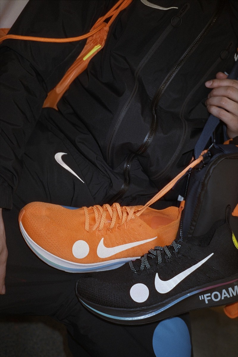 在比賽前將運動服與休閒服裝混搭,一路聽著嘻哈音樂趕去參加中學的足球比賽,是Abloh在學生時代對足球最深刻的回憶。Abloh說:「無論是足球這個詞本身,還是足球的悠久歷史,從審美角度來看,都有其獨特之處。歐洲俱樂部隊球衣胸前的贊助商Logo時常帶給我靈感。在設計這一系列過程中,那些各式各樣精美的印刷體實在是太漂亮了。」Flyknit Zoom Fly鞋款顯然是該系列的靈感來源,「我總希望能在球鞋觸球的位置設計點什麼。因此,我在鞋上畫了一個點;在你踢球的一瞬間,腳、眼協調能力是唯一可能產生誤差的部分,而這就是該系列的最初的構想。」Abloh表示,這一系列跑鞋模仿了球場上真實的感受,如此便能在潛意識中時刻保持訓練激情。