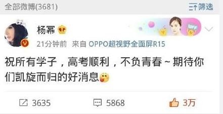 楊幂本人也在微博上寫著:沒想到會引起那麼大的爭議,看到有人評論,特意查了一下,凱旋而歸是有爭議的用詞,怕誤導考生朋友,還是改一下吧。