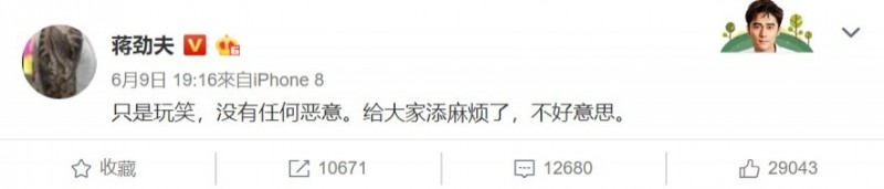 有網友當起鍵盤柯南,翻過去的舊照發現,蔣勁夫和張晟經常出雙入對,除了戴同款項鍊,還有不少曖昧文,性向引起關注,對於貼文遭眾人揣測,蔣勁夫趕緊在微博發文滅火,「只是玩笑,沒有任何惡意,給大家添麻煩了,不好意思。」