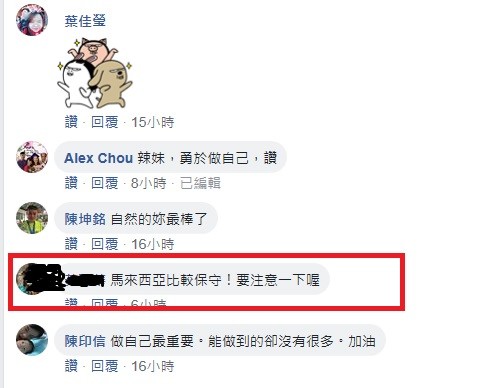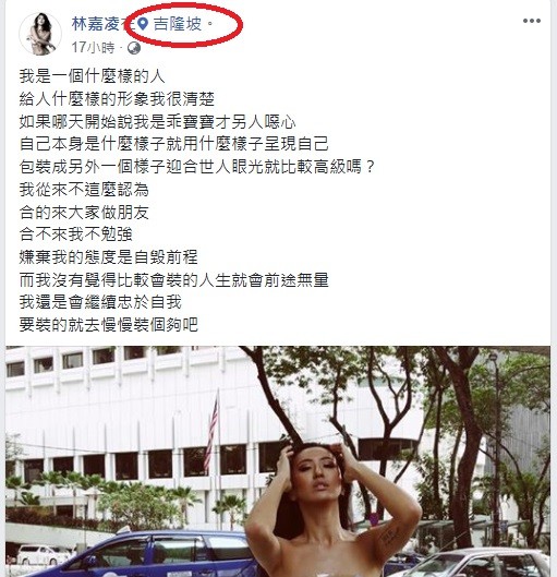 「我從來不這麼認為,合的來大家做朋友,合不來我不勉強」,薔薔說,她還是會繼續忠於自我。昨她透過臉書吐露這席話時,標註人正在「吉隆坡」,照片則是在街頭爆乳辣照,有粉絲提醒她:「馬來西亞比較保守,要注意一下喔!」至截稿為止,薔薔尚未作出回應。