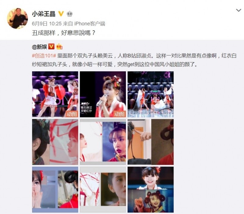 最近中國選秀節目《創造101》中的選手賴美雲,因梳了丸子頭,穿上紗裙表演,被指造型和邱淑貞當年在電影《倚天屠龍記之魔教教主》中飾演的「小昭」的模樣很像,還有人貼出對比圖。沒想到連王晶都聽到傳聞,更在微博轉貼圖片留言:「丑(醜)成那樣,好意思說嗎?」再度引發熱議。