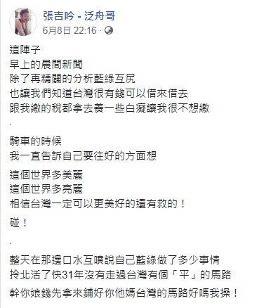 「整天在那邊口水互噴,說自己藍綠,做了多少事情」,泛舟哥不客氣說:「拎北活了快31年,沒有走過台灣有個『平』的馬路。」最後他更爆出口,「X你娘,錢先拿來鋪好你他媽台灣的馬路,好嗎?我操!」