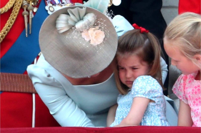 喬治小王子的妹妹夏綠蒂公主,則不知是否不耐典禮時間太久、氣候太熱,竟貌似快昏倒,幸好媽媽凱特王子妃一把把女兒抱起來拍拍,只見小公主立馬在媽媽懷中哭哭撒嬌,模樣惹人憐愛。