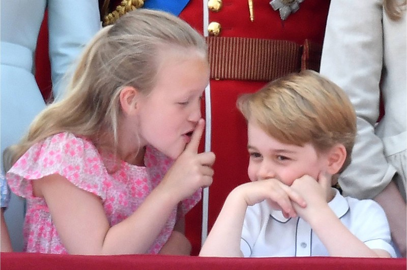 喬治小王子在典禮上情不自咧開小嘴跟著唱歌,也不時對著空軍儀式指指點點,被身旁英女皇外孫彼得菲力普的7歲女兒莎凡娜伸手摀住嘴巴,還對喬治比出「噓」的表情,暗示他要小聲一點。