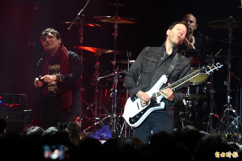 〔記者吳琬婷/台北報導〕美國搖滾樂團「大人物合唱團」(Mr. Big)今晚在三創生活園區CLAPPER STUDIO演出,演唱會先由知名歌曲《Daddy, Brother, Lover, Little Boy》開唱,演唱到間奏時吉他手Paul Gilbert還特別與貝斯手Billy Sheehan互飆搖滾,同時兩人還特別大秀了一段用電鑽彈奏樂器,讓台下的樂迷尖叫連連。