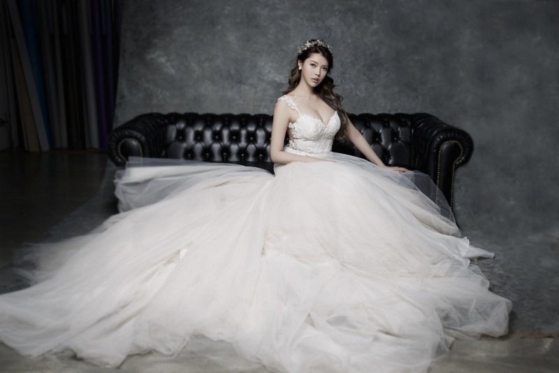 晚宴當天的禮服及拍攝的4套婚紗,殷琦選定香檳蕾絲訂製婚紗的以色列品牌Liz Martinez,婚紗主要呈現殷琦優雅、時尚、性感的多變風格。