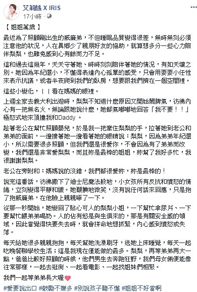 艾莉絲表示近來為了照顧剛出生的兒子,睡眠品質變很差,無法像以前一樣全心陪伴女兒,梨梨因年紀小不懂表達自己的感受,只能耍小任性來抗議。上星期艾莉絲全家一起到義大利遊玩,梨梨無來由的發起脾氣,艾莉絲形容「彷彿內心有一把無名火」、「極怒式地來頂撞我和Daddy」,艾莉絲見狀便把女兒拉到老公及兒子面前,認真的對她說:「梨梨,因為弟弟年紀還小,所以需要很多照顧,但我們還是很愛你,不會因為有了弟弟而改變,我們還是非常愛梨梨,而且妳是最棒的姊姊,妳幫了我好多忙,我很謝謝梨梨。」