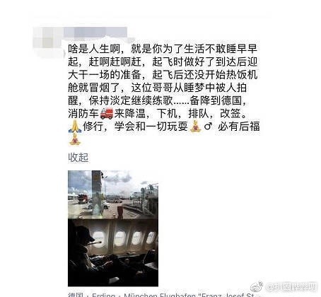黃曉明身旁的工作人員在社群網站發文,表示他們所搭乘的飛機才剛起飛就開始冒煙,之後迫降至德國,出動消防車給飛機降溫,所有人都受到不小的驚嚇。黃曉明在睡夢中被人叫醒,第一個反應竟是繼續淡定練歌,只見照片中黃曉明翹著腳盯著手機螢幕,彷彿身旁發生的事都與他無關,讓粉絲笑說「這麼淡定,一看就是經歷過大場面的人」、「注定要幹大事的人」、「我不是不慌,只是慌到只敢唱歌了」。