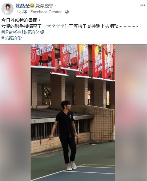 兩人的12歲女兒是學校籃球隊的主力球員,經常在比賽中有優異表現,學校將小球員們的照片與名字做成掛幅掛起,夫妻倆今日到學校時發現女兒的掛幅歪了,只見李李仁不顧老婆詢問是否要梯子,二話不說就跳上高處將女兒的照片掛整齊,接著又淡定的跳下來,帥氣模樣讓陶晶瑩感動的說「好希望有這樣的父親」。粉絲們看了也表示「情人的照片,怎麼能讓它歪斜」、「李仁哥滿滿的驕傲耶」、「這樣耍帥太犯規」。