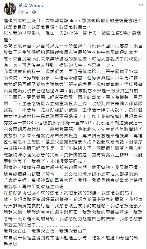 32歲的黃瑄靠著8點檔《春花望露》惡媳婦麗華知名度大增,過去更演出過《雨後驕陽》、《牽手》、《戲說台灣》等戲。今(19)她在臉書與粉絲分享自己的產後憂鬱,自從生完小孩後,她表示現在每天生活都在集乳、餵奶、拍嗝、哄睡、換尿布、洗衣物的無限輪迴,時常感到無力感與看不到未來無所適從的恐慌感。