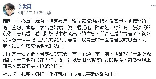 這位阿姨要下車前竟還塞了一張紙條給小炳,當他既期待又怕受傷害的打開紙條後,發現上面寫了「拉鏈沒拉」4字,讓小炳崩潰吶喊:「救命啊!我要去哪裡消化我現在內心無法平靜的激動!」粉絲們看了笑說「我覺得阿姨內心應該比較激動」、「阿姨心想~小壞壞」。