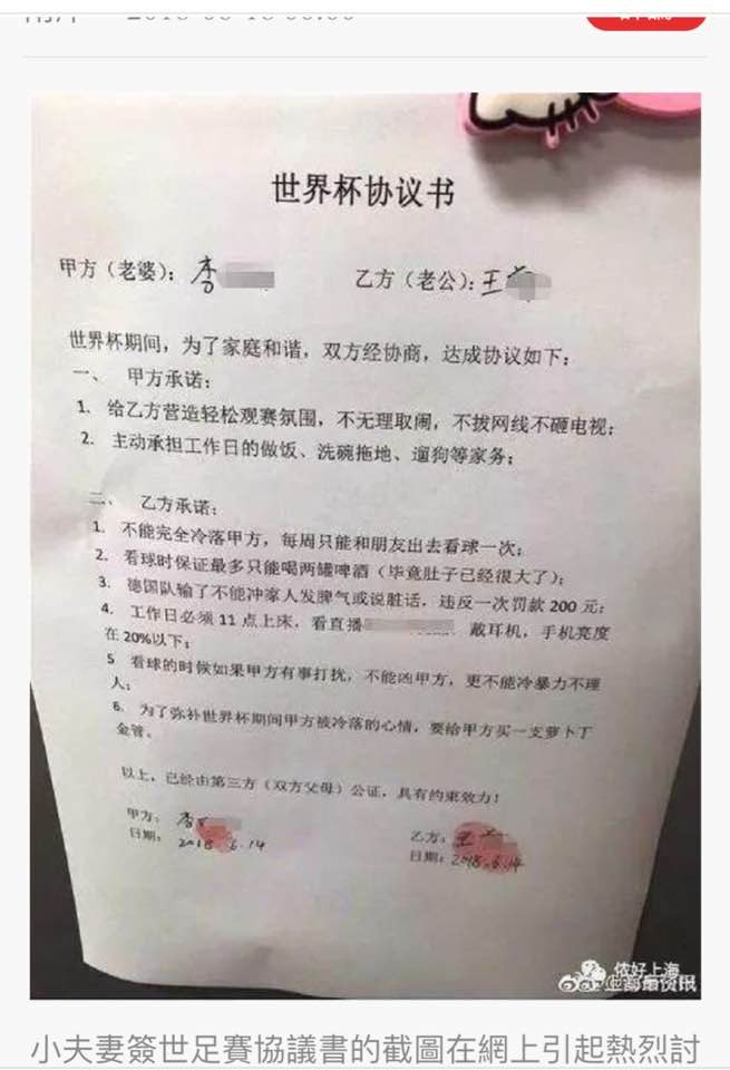 在邱彰曝光的「世界杯協議書」中,世界杯期間,為了家庭和諧,夫妻雙方經協商後,達成以下協議,包括妻子承諾給老公營造輕鬆觀賞氣氛,不無理取鬧,不拔網路線也不砸電視;同時要主動承擔在上班日煮飯、洗碗拖地、溜狗等家務事。