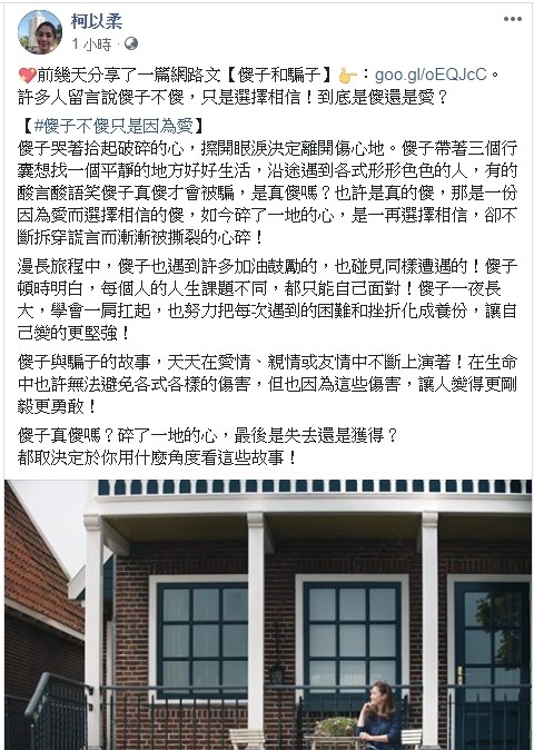 日前郭宗坤爆出心臟病發差點死在家中,對此,網友碎嘴柯以柔原諒,柯以柔便直接反擊「水潑落地難收回」,離婚意志堅決,柯以柔也在直播中強調「我的家人現在都跟我住在一起,沒有跟我住在一起的不是我的家人」,如今柯以柔再度在臉書發文,坦言「傻子不傻只是因為愛」,柯以柔自比傻子,感嘆「那是一份因為而選擇相信的傻,如今碎了一地的心,是一再選擇相信,卻不斷拆穿謊言而漸漸被撕碎的心」。