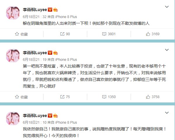 李雨桐高分貝說,做了10年生意,現有老本夠用10年了,「早就把錢和名利看透了,做點自己喜歡做的事就行了」,最後一篇更是砲火全開:「躲在陰暗角落裡的人,出來對質一下唄。」其實昨晚前前後後,李雨桐一共發了10餘篇文章,怒氣未消。
