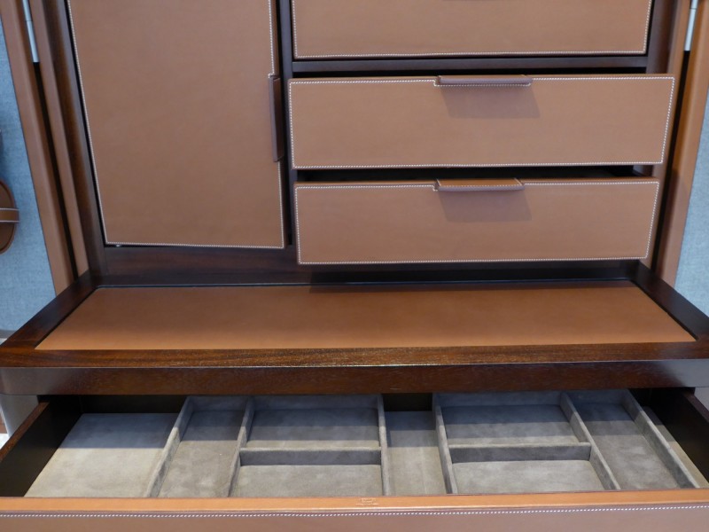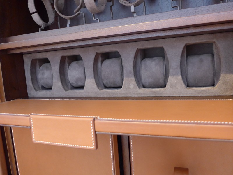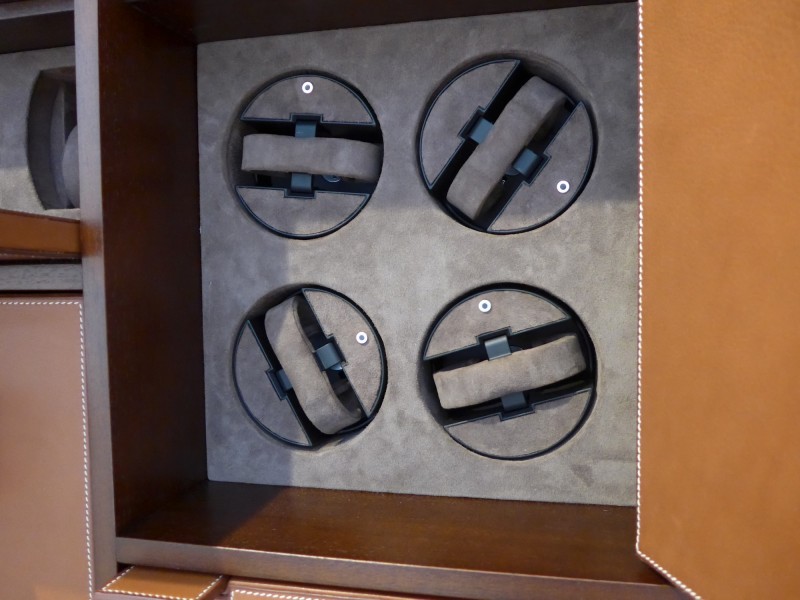 以一座可收藏約莫上百只腕錶的收藏櫃來說,最上層以「展示」為形式,替手錶打造了一處前後兩排、前低後高的收納陳列區。順著下來可見提供4只腕錶同時上鏈的自動上鏈盒,以及提供給貴重錶款的抽屜式收納區。最底部的抽屜可放置首飾配件或可更換式錶帶。