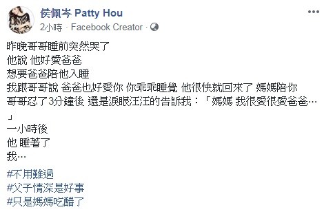 侯佩岑表示大兒子前一晚睡前突然哭了起來,並說他很愛爸爸,想要爸爸陪他睡覺,侯佩岑便安慰他「爸爸也好愛你,你乖乖睡覺,很快就回來了,媽媽陪你」,兒子聽了後安靜3分鐘,接著又忍不住淚眼汪汪的對侯佩岑說「我很愛很愛爸爸」,一個小時後兒子才好不容易入睡,這段對話讓侯佩岑自我安慰「不用難過」、「父子情深是好事」,但最後還是承認有些吃醋。粉絲們笑說「別難過,這是幸福的味道」、「可能妳不在家時他也這樣對爸爸說」。