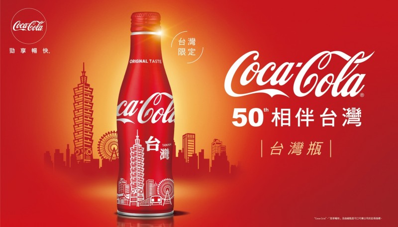 可口可樂1968年正式在台販售,歡慶50年,可口可樂在今年陸續推出「花卉瓶」、「黑熊瓶」、「古厝瓶」、「美食瓶」與「懷舊瓶」等五款結合台灣在地風情的玻璃曲線瓶,引起廣大討論,「台灣瓶」為首支以台灣地標為設計主體的鋁瓶,經典的紅色曲線瓶身巧妙融合手繪風格的台灣城市意象,結合台北101、捷運、摩天輪等,6月20日起於各大通路上架。此外,可口可樂更與台北101合作兩款紀念禮盒,於台北101獨家販售,預計再創一波可口可樂收藏熱潮。