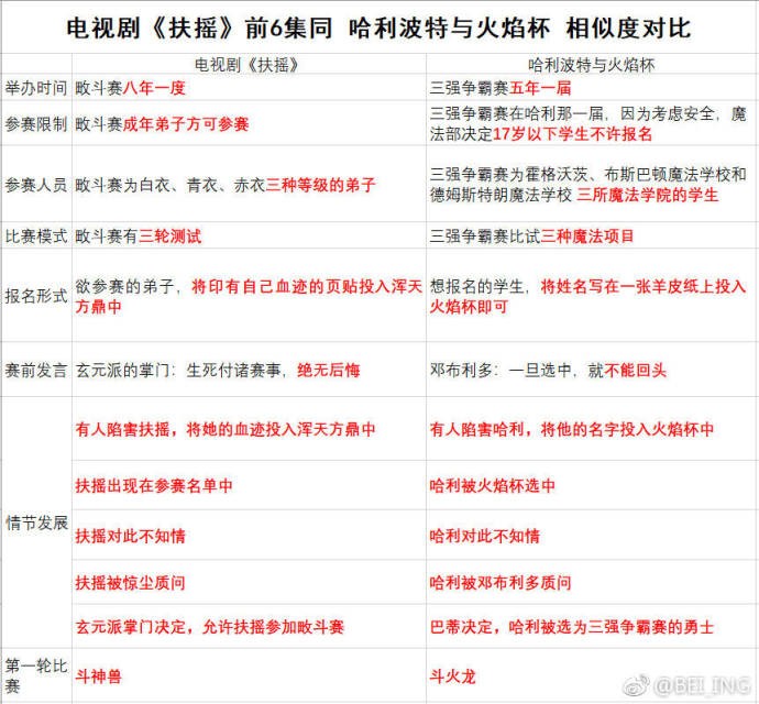 有人認為《扶搖》前6集的劇情與《哈利波特:火盃的考驗》相似,《扶搖》中只有白衣、青衣、赤衣3種等級的弟子能參賽,《哈利波特》則由三個學院的學生參加,兩者的報名方式都是將東西丟入容器中,且都有3種測試項目。另外,2部作品的主角都是遭人陷害後才發現自己參賽,經過質問後2人都成為選手。