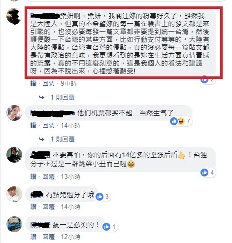 有中國網友隨即留言,告訴劉樂妍關注她的臉書很久了,「雖然我是中國人,但真的不希望妳的每一篇在臉書上的發文,都是來引戰的,也沒必要每發一篇文章,都非要提到統一台灣,然後順便酸一下台灣的某些方面。」