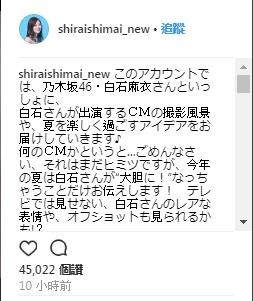 這個帳號日白石麻衣為了代言品牌而開的帳號,未來陸續會有更多訊息公開,白石麻衣在自我介紹欄上寫著:「請20歲以上的人再來追蹤喔」讓人好奇她到底代言了什麼?IG上也透露在7月3日會有更多訊息發布。