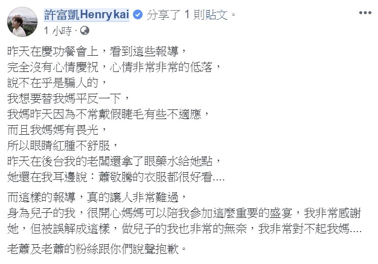 許富凱今在臉書解釋:「我想要替我媽平反一下,我媽昨天因為不常戴假睫毛有些不適應,而且有畏光,所以眼睛紅腫不舒服,昨天在後台我的老闆還拿了眼藥水給她點,她還在我耳邊說:蕭敬騰的衣服都很好看....」