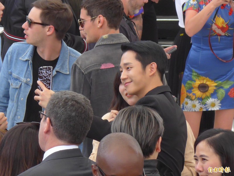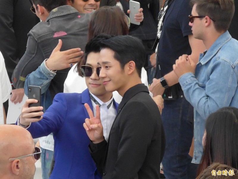 丁海寅在Dior巴黎男裝秀前不斷的應粉絲要求合照,大展暖男氣度。(記者方惠宗攝)![]() 丁海寅在Dior巴黎男裝秀前應粉絲要求玩自拍。(記者方惠宗攝)