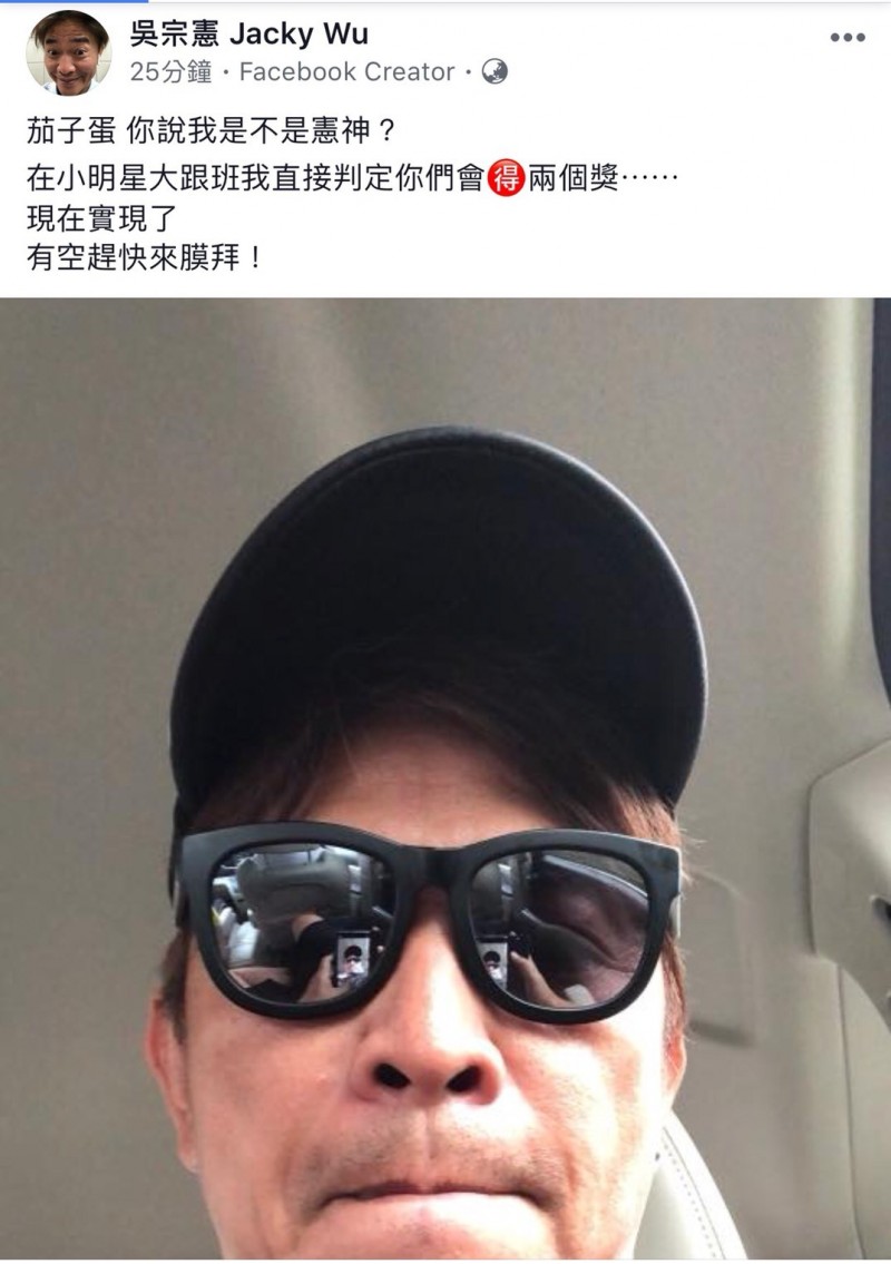 吳宗憲在臉書上表示:「茄子蛋,你說我是不是憲神?在小明星大跟班我直接判定你們會得兩個獎,現在實現了,有空趕快來膜拜!」網友也紛紛留言附和:「真的太厲害了!」、「神準!」