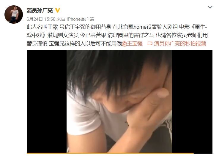 中國演員孫廣亮在微博分享影片解釋道,這些人真的是中國演員、劇組人員,卻設置騙人劇組,以「潛規則」騙女演員上床,其中一名挨打男叫「王露」,是演員王寶強的御用替身,另一名男子則是製片副手佳樂,隨後他也PO出佳樂被眾人摑巴掌、道歉的影片。