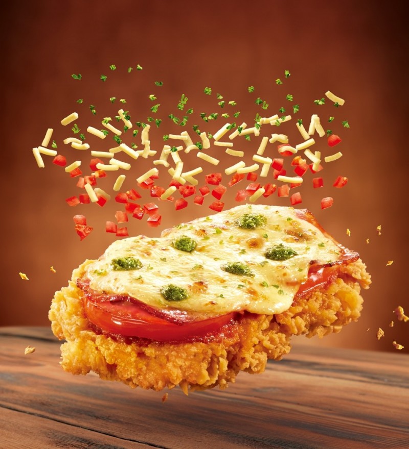 2016年推出的CHIZZA披薩雞腿排,以酥脆鮮嫩的無骨雞腿排取代披薩餅皮,並放上濃郁的起司和多樣美味食材,層疊出是披薩也是雞腿排的多層次華麗美食,廣受消費者好評。今年肯德基更以受歡迎的義大利經典披薩口味概念發想,推出「義式三重奏披薩雞腿排」;在現炸的酥脆無骨咔啦雞腿排上,先加入清爽的義式披薩醬、並放上新鮮番茄片、煙燻培根,與馬茲瑞拉起司,還點綴上經典的義式青醬,繽紛熱情的紅、白、綠三色相互搭配,十分搶眼。