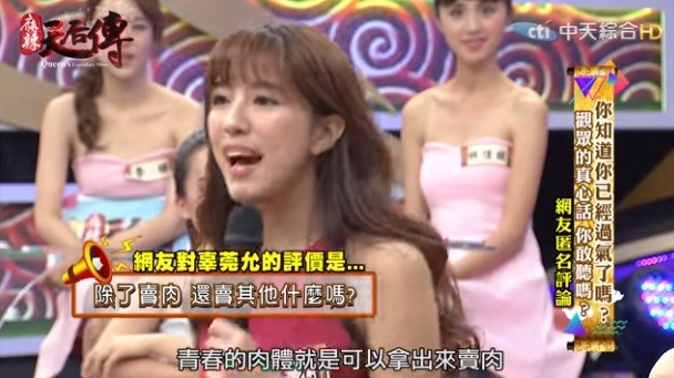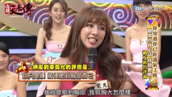 辜莞允在《麻辣天后傳》中挑戰聆聽觀眾的真心話,一開始就有人狠批她身材腫,只是剛好肥到胸,以及她只是個越來越寬的花瓶,辜莞允都不以為意的說「我就是奶大怎樣」,更有人問她除了賣肉還能做什麼,辜莞允霸氣回擊「青春的肉體就是可以拿出來賣肉」。不過後來有酸民調侃「妳是劉品言嗎?喔不是,劉品言比較白」,這讓辜莞允有些無法招架,只能說「膚色方面沒什麼好反駁的,我就是長這樣」,真性情反應贏得眾人讚賞。