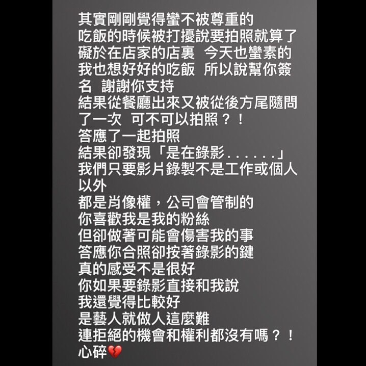 因經紀公司規定,若藝人要錄製影片,如非工作或個人拍攝,都有肖像權保護,粉絲舉動讓她十分傻眼和無奈,並感覺不被尊重,在IG表示:「如果你要錄影直接跟我說,我覺得還會比較好,是藝人就做人這麼難,連拒絕的機會和權利都沒有嗎?!心碎。」而該名粉絲還表明自己是馬來西亞的YouTuber,等於影片可能會讓更多人看到,事後她趕緊跟公司解釋這件事,不過粉絲也紛紛安慰她也許只是誤按,不用太在意。