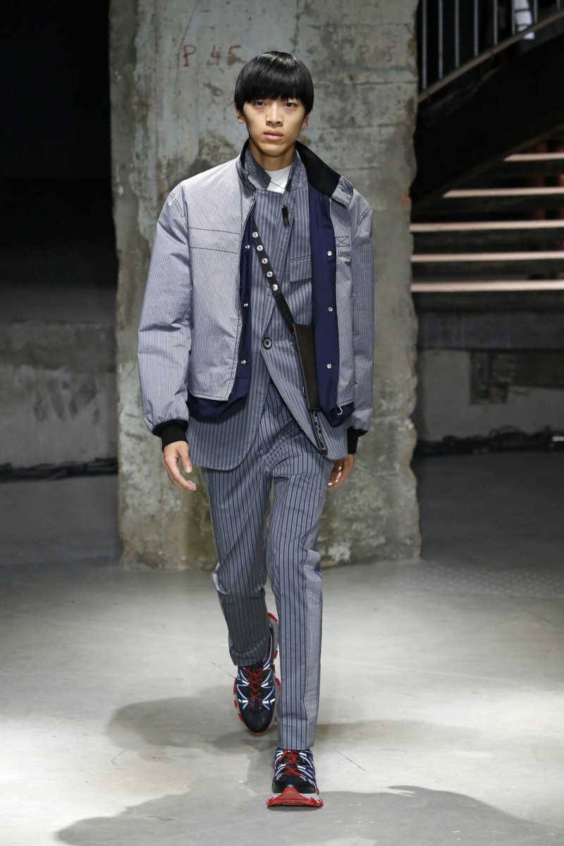 Lucas 補充:「這涉及到各種對比鮮明的演繹,如日裝與晚裝元素、彩色與黑白、硬挺與柔軟、平面與立體等。」例如帶有濃厚軍裝風的西裝融合了男士禮服的極佳質感與優雅;簡約的條狀織物嵌飾縫在飛行員夾克的內外兩層之間,令廓形更加立體飽滿,營造出若有似無的視覺遊戲。