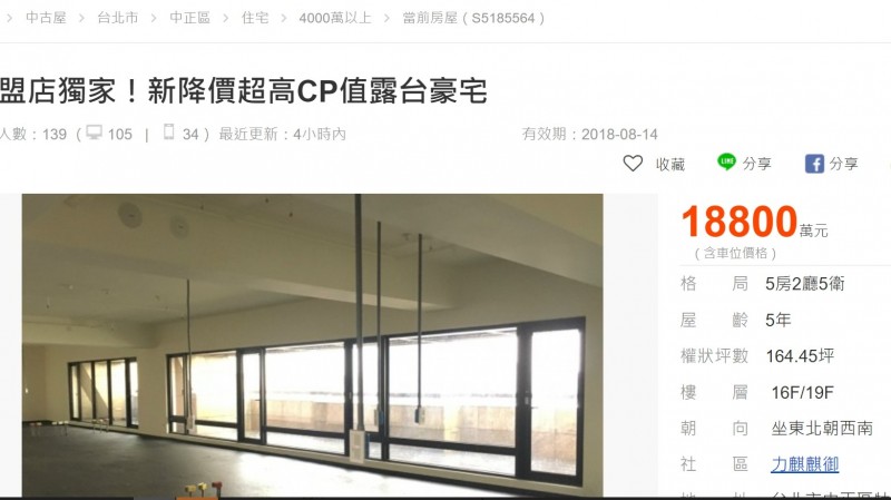 〔記者鍾智凱/台北報導〕43歲名模林志玲今被周刊爆出要賣超級豪宅,她要將200多坪「力麒麒御」託售換現金,物件目前已被放上房地產交易網,開價1.88億。 根據《蘋果日報》,房產網站上有一個物件,目前仍為毛胚屋,總坪數164.45坪,位於19樓中的16樓,屋齡5年,若含車位,業者估計總價應達2億元,而這就是林志玲欲脫手的豪宅。 林志玲是在2016年5月入手此屋,當時以總價1.57億元購入,若順利以1.88億元賣出,算算僅持有2年就讓她賺進超過3千萬元。林志玲。(翻攝自微博)林志玲待售的毛胚屋。(翻攝591房屋交易網) 娛樂城 通博娛樂城 老虎機