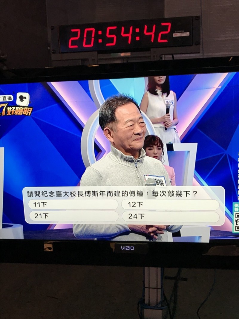 他當時毫不猶豫回答「11下」,並表示每次上課鐘響他都來不及數完所以認為不可能超過20下,然而正確答案揭曉是21下,原因是前台大校長傅斯年的名言:「1天只有21小時,剩下3小時是用來沉思的。」因此每次都是敲響21下。