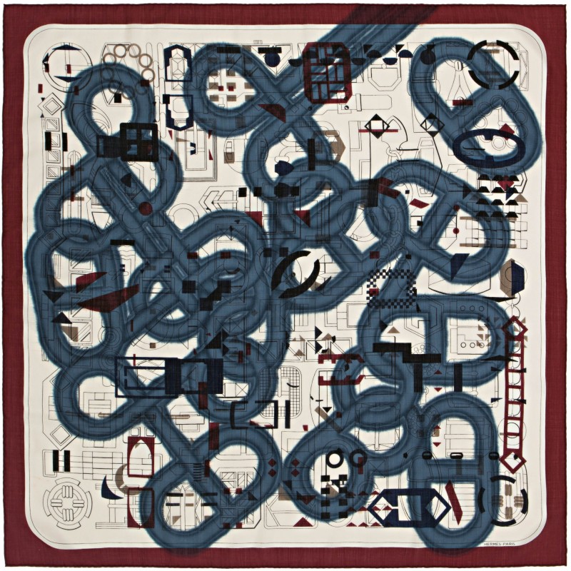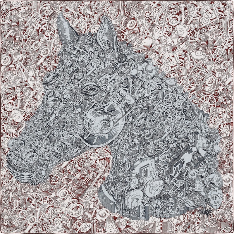 愛馬仕更首度邀來畢業於倫敦中央聖馬丁學院和皇家藝術學院的法國年輕設計師Octave Marsal作畫,為一款140公分見方的喀什米爾羊絨與真絲混紡圍巾賦予由汽車零件所組成的巨幅馬頭圖案;包括引擎裝置、活塞以及汽缸等細節,整幅圖紋融合復古與當代風格設計,成為一款別出心裁的獨特創作。