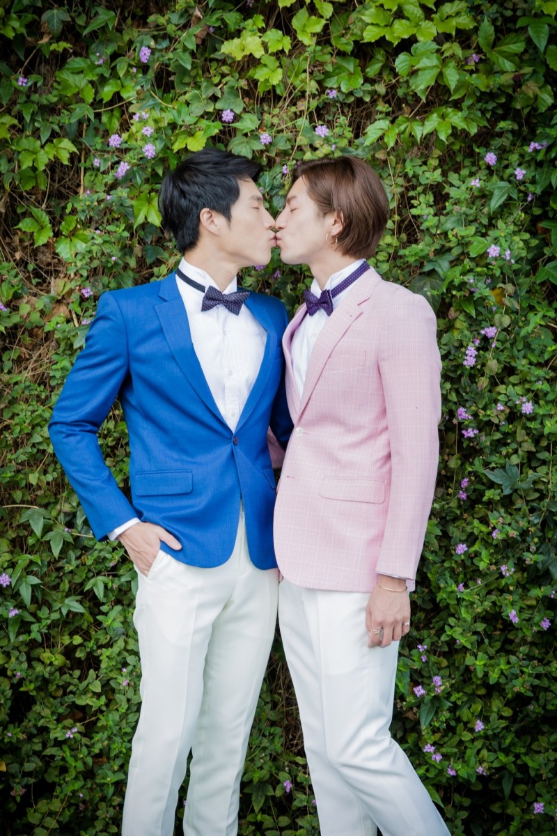 〔記者粘湘婉/台北報導〕王樂妍、小蠻、唐振剛、福地祐介主演故事工廠、夢田文創《偽婚男女》舞台劇,昨宣布加開台北國家戲劇院場次,4人各自穿上西裝與婚紗,拍攝婚卡感謝粉絲。小蠻劇中扮演帥氣女T,特地剃頭從左到右剃了半圈,她第一次以這麼MAN的狀態拍婚紗,笑喊「沒有頭髮的感覺很奇怪」;王樂妍頂32C好身材穿婚紗,視覺效果晉級到D罩杯,一旁小蠻用火熱視線緊盯,讓王樂妍忍不住笑喊「實在太害羞了!」第一次被女生這樣盯著看,真的有被小蠻的帥氣給電到。